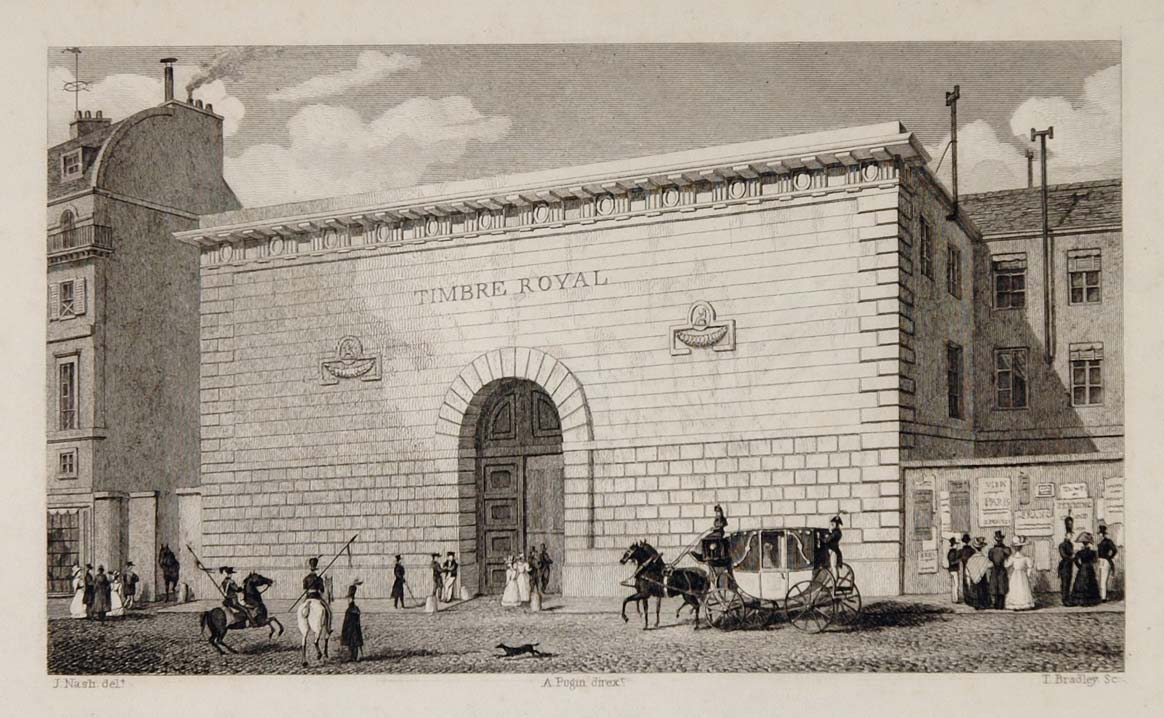 This is an original 1831 copper engraving of the Timbre Royal (Stamp Office), Paris.