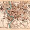 This is an original 1908 color lithograph map of the Tiber River in Rome, Italy, with a tourist route marked in red, leading from Ponte S. Angelo down to Via di Pettinari and back up in the direction of Hadrian’s Mausoleum.
