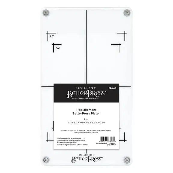 Replacement BetterPress Platen works in the BetterPress System. The Platen is a clear top plate with registration marks. It helps to guide placement of the card panels when letterpressing with your inked press plate.