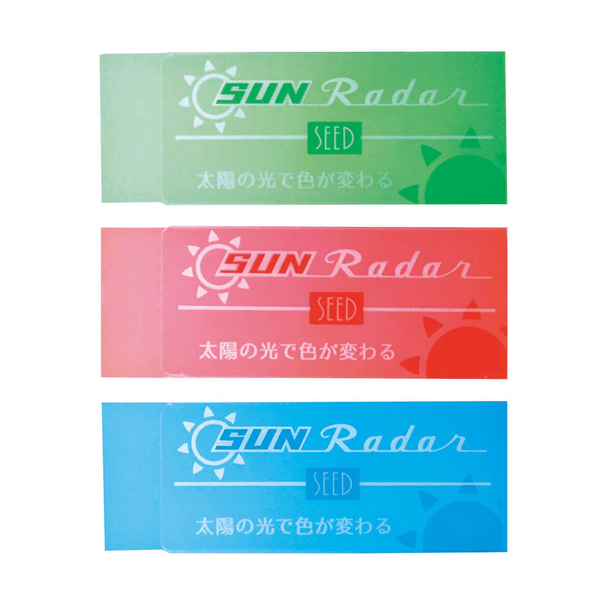 Sun Radar Colour Changing Eraser by Seed Co. Ltd. Japan. The Sun Radar is a semi-transparent eraser that changes colour when exposed to sunlight. You can enjoy two different colours between sunny and shaded areas.
