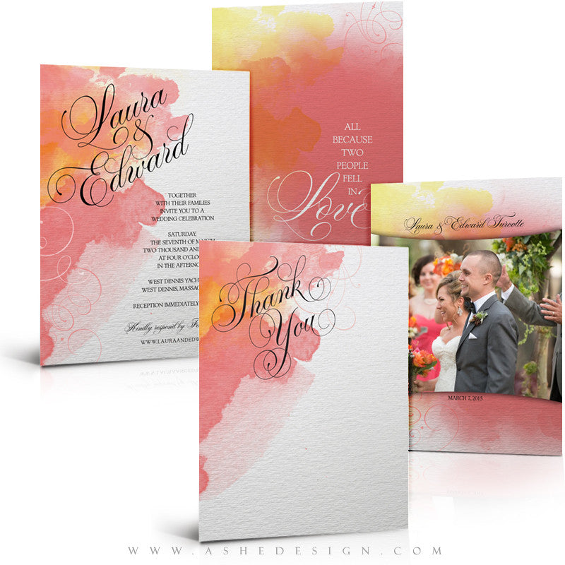 Offer beautiful Wedding Invitations and Thank You cards to your clients with our new Watercolors set. Use these Photoshop Templates to easily design beautiful Wedding Invitations and coordinating Thank You cards that brides will love!